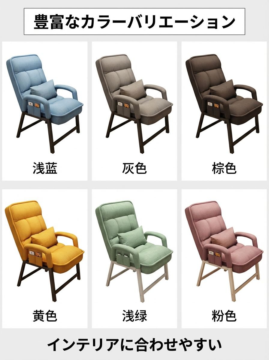 色:湖ブルーのシングルチェア、グレーのシングルチェア、ブラウンのシングルチェア、メープルイエローのシングルチェア、ミントグリーンのシングルチェア、ピンクのシングルチェア、厚手スポンジクッション付き湖ブルー